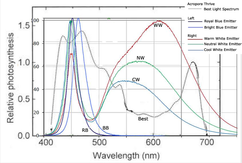 Unfortunately many LEDs including the Ocean Revive/Evergrow, will produce great PAR measurements, however it is not rocket science to realize that a PAR meter ONLY measures light energy within the 400 to 700 nanometer range. So, while one light might measure a higher PAR mmol reading, another light might be still superior due to the more important PUR output.