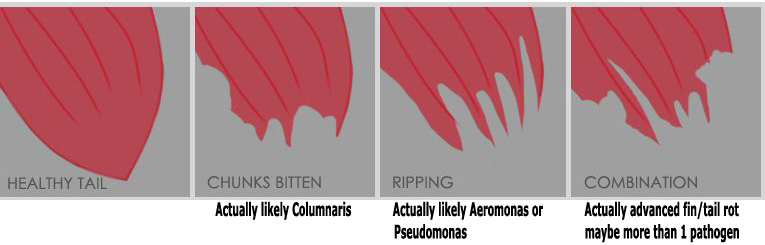 - Fin/tail infections, usually from Aeromonas